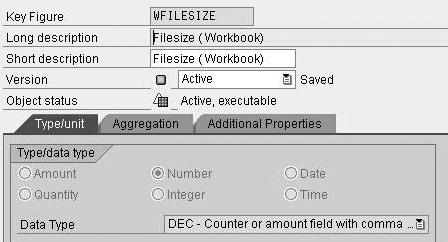 Create a new InfoObject for the new attribute for InfoObject 0TCTWORKBK. Use Number as the Type/data type (Figure 12). This allows you to assign the value for Filesize next. To do this, add the new generated characteristic as attribute to 0TCTWORKBK and activate the InfoObject.