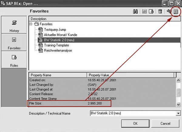 I’ll share a little trick for users to find out the size. In BEx, select Open Workbook from the BEx toolbar and turn on the property window by selecting the icon in the upper right corner of the dialog (Figure 6). Then, check your actual file size. In my example it’s 2,995,200 bytes or 2.9 MB.
