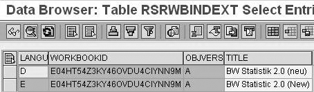 You might also be interested in the workbook name because some companies save workbooks using the naming convention with refreshed data or a similar name to provide a manual user refresh (i.e., for higher management). To look up workbooks by name, use the WORKBOOKID field and create a second mode in transaction SE16 (open another session and enter the transaction again) for table RSRWBINDEXT. This table stores the description of each workbook (Figure 8). Type in WORKBOOKID and version A (active) to find the appropriate language-dependent name by selecting your country-specific language like D for German or E for English.