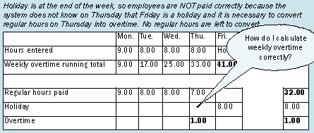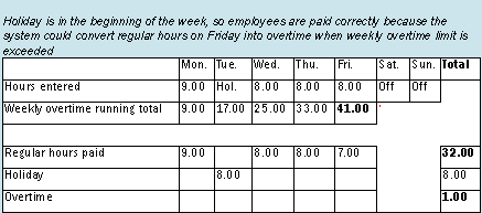 Everything is fine if the holiday occurs in the beginning of the week (Figure 2). Holiday hours are successfully counted toward the weekly overtime limit, and extra regular hours on Friday are successfully converted into overtime.