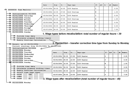Then the system converts all overtime hours into regular hours and recalculates the whole week. If an employee works nine hours on both Monday and Tuesday and then seven hours on Wednesday, R/3 recalculates the whole week while taking into consideration these correction hours.