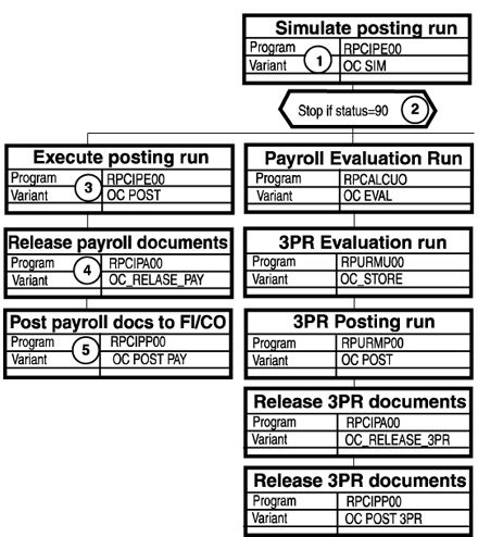 Five of the steps in the payroll process are for creating and posting the results to FI/CO. Figure 1 shows the part of a customized process model that creates results for posting to FI/CO. The stops for posting payroll to FI/CO are numbered.
