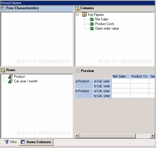 The SAP NetWeaver BW query you use is based on the MultiProvider 0D_NW_M01 from the SAP NetWeaver demo model. The query contains two characteristics: Product and Cal. year / month as well as a set of key figures (Figure 1). As part of the query make sure you configure the characteristic Product to show the key and description and the characteristic Cal. year / month to show the key only.