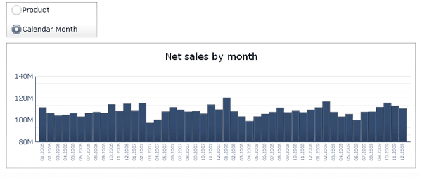 Up to now, the Xcelsius dashboard shows the net sales revenue either by product or by month. Now I show you how to add two charts and enable the drill down from the first set of charts to the second set of charts.