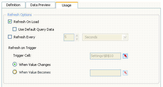 Step 4. Navigate to the Usage tab. Select the option Refresh on Load and close the Data Manager.