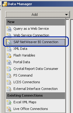 Start the Xcelsius Designer by following menu path Start > Programs > Xcelsius > Xcelsius 2008. Then select Data > Connections and click the Add button. Select the entry SAP NetWeaver BI Connection (Figure 2).