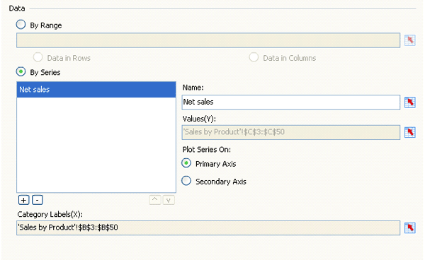Step 2. Select Net Sales in the Series list. Click the reference icon next to Source Data and select the cells A3 to B50 from the Sales by Product sheet.