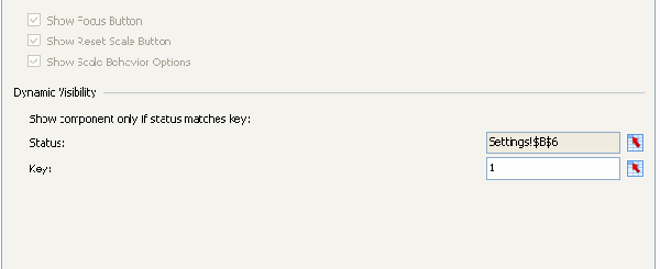 Step 2. Right-click the new chart and go to Properties > Behavior > Common. Click the reference icon next to Status for the Dynamic Visibility and select cell B6 from the Settings sheet. Set the Key to the value 1.