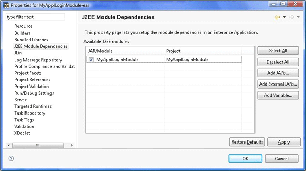 Now you can create the enterprise application file (EAR file). In SAP NetWeaver Developer Studio, select the enterprise application project (e.g. MyApplLoginModule-ear project). Right-click and select Export > SAP EAR file options. Enter the name of the EAR file and select its location. The system creates a deployable enterprise application file that you can deploy in the SAP J2EE server.
