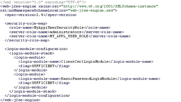 From the security and authentication point of view, the example web-j2ee-engine.xml deployment descriptor contains two elements: the security-role-map element and the log-module-configuration element.
