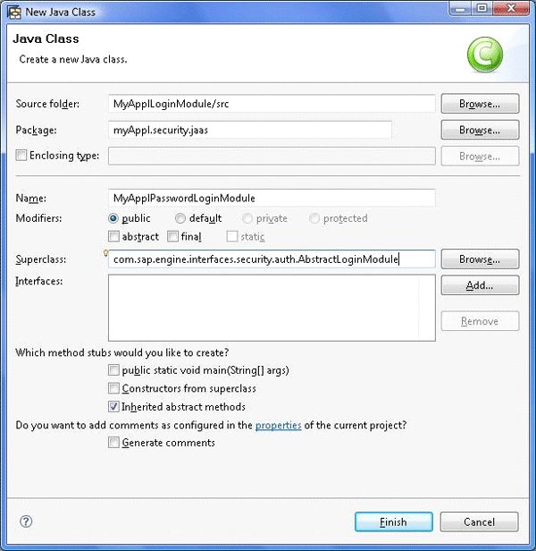 In the next wizard step, create the login module implementation class. Select the project, right-click, and follow menu path Project > New > Class. This starts the Java class creation wizard (