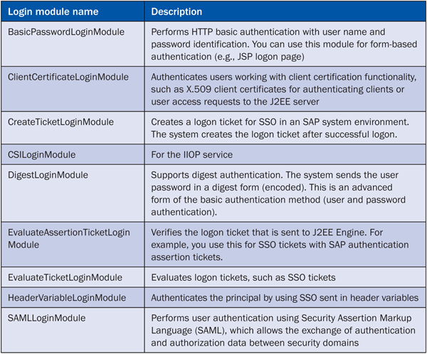 Table 2 provides a list of the common SAP login modules that you can use to determine user authentication.