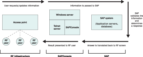Radio frequency (RF) devices allow you to capture or create data quickly and accurately from any location and transmit it directly into your SAP system. Usually small and handheld, they are integrated with SAP’s Warehouse Management (WM) system and Task and Resource Management (TRM). The SAPConsole method of connectivity uses a standard SAPGUI-based screen environment, which is reduced in size and uses buttons and plain text stripped of formatting embellishments. WebSAPConsole and SAP NetWeaver Mobile offer more elaborate, graphical, character-based interfaces that feature touch screens. In warehouse environments, RF devices are typically useful for goods receipt, goods issue, putaway, picking/replenishment, interleaving, packing and unpacking, inventory counting, loading and unloading, serial number capture, inquiries, movement by storage unit, and posting changes.
