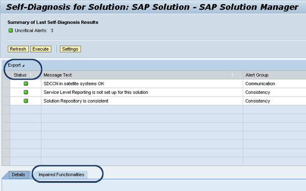 This triggers self-diagnosis on that solution only and has solution-specific results (Figure 6). For both kinds of self-diagnosis, the summary of results from the last self-diagnosis is found in the top half of the results screen. This shows the number of uncritical, critical, and very critical alerts and functionalities. Below the summary, you can view the details of the self-diagnosis results, analyze them if required, and take corrective measures in accordance with the solution guides provided.