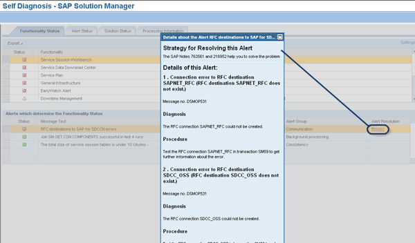 As with solution-specific self-diagnosis runs, you can export these results to Excel. Details of the functionality status, if there are any, are located at the bottom of the screen that appears when you click the Functionality Status tab (Figure 8). You can see an overview of the status values of the underlying (critical) alerts. The Alert Status tab provides instructions to remove critical alerts. Click the Display link in the Alert Resolution column on the right to see how to remedy alerts with a critical status.