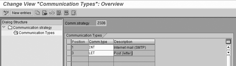 To model this scenario, follow IMG menu path Sales and Distribution>Basic Functions>Output Control>Determine Communication Strategy. Click on the New entries button at the top of the screen and provide a four-character/digit technical name, starting with either Z or Y, and a helpful description (Figure 1). Then select the new communication strategy and double-click on the Communication Types item in the left menu tree.