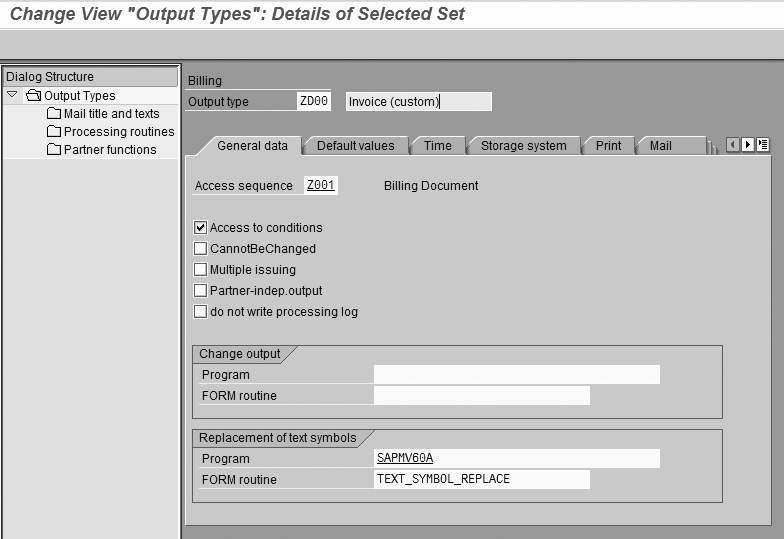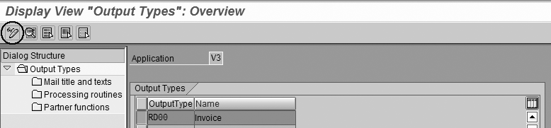 Follow IMG menu path Sales and Distribution>Basic Functions>Output control>Output Determination>Output Determination Using the Condition Technique>Maintain Output Determination for Billing Documents> Maintain Output Types or use transaction V/40. If you don’t have a custom output type already configured for invoices, click on the change display icon in the top left corner to access change mode (Figure 2). Select the standard output type RD00 and click on the copy icon to create a custom output type.