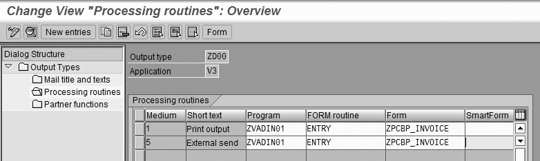 Select the new output type ZD00 and double-click on the Processing routines option in the left menu to access the print program and SAPscript form assignment. One of your developers will more than likely have to create both of these. Make sure to maintain an entry for medium 5. Figure 4 demonstrates a possible assignment. The print program is important in the determination of the sender’s email address and the subject line of the email.