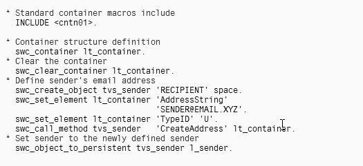 You can enhance this functionality even further. For example, more advanced ABAP logic could determine the sender’s email address dynamically from the sales office address on the billing document. You can use standard container macros that you access via standard include <CNTN01> in the custom print program.