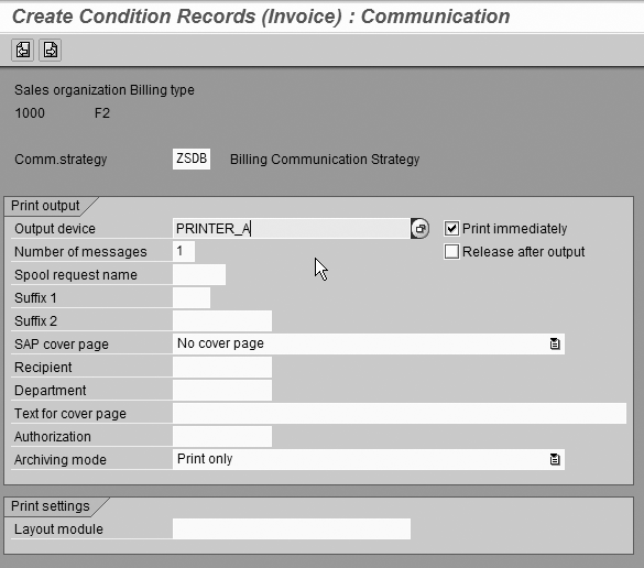 Next, select the new record and click on the Communication button in the top left corner. Specify communication strategy ZSDB, printer name (in case customer master data has no email address), and number of messages and check the Print immediately option (Figure 7).