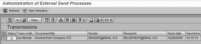 To monitor outgoing invoices, follow SAP Easy Access menu path SAP menu>Tools>Business Communication>Communication>SAPconnect or use transaction code SCOT. From here you can monitor the overall SAPconnect activity. For a more detailed view of the emailed output documents, go to the top menu and select Utilities>Overview of send orders. You can also use transaction SOST to access this report. Specify a valid date range, communication method INT (to limit the report to email activity only), and the statuses you are interested in (errors, sent successfully, in transit, and waiting), then execute the report.