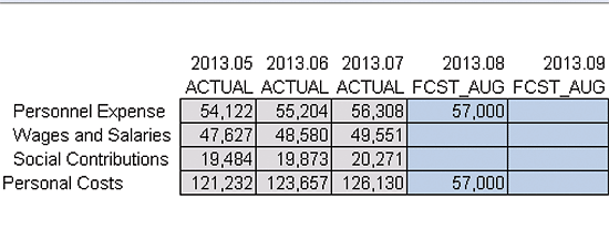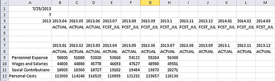 Most companies require rolling forecast input forms that display actual data in read mode and forecast data in write mode. Because this process is repeated each month, it is also a requirement to automatically determine the current month for the user and then format prior versus future months separately. I use a property of the category members (such as ACTUAL or FCST_AUG) to drive the formatting for actual versus forecast data for a low-maintenance solution that automatically locks the actual months for data entry and highlights the forecast months to allow data entry. The master data can then remain the same from month to month.