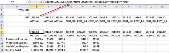 The EPMOlapMember function has five parameters. Only the first parameter is available for cell referencing; the system controls the rest. Therefore, you need to reference the current year/month into the first parameter of this function. You do this by accessing the formula in the function bar, add B3 for example in the first parameter following by a comma. Then delete one of the unused parameters.