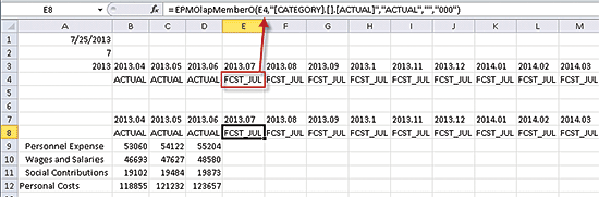 By using the same technique of referencing the EPMOlapMember function to the category IDs in row 4, you also derive the category member in the EPM report in row 8 (Figure 25).