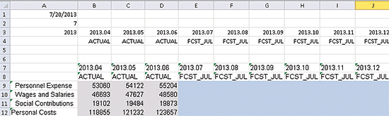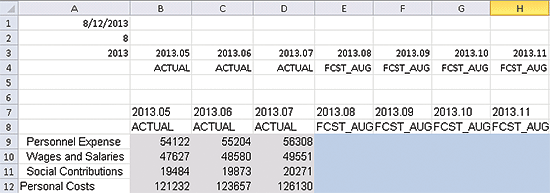 To close the EPMFormattingSheet, choose View Formats. To render the new formatting, choose Refresh. Now you can see the results in Figure 39. Actual months are in gray, whereas the forecast months are in light blue by design.