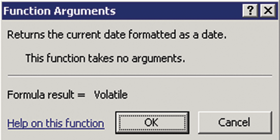 The best way to add functions into an Excel worksheet is by merely typing the first few characters and letting Excel’s autocomplete propose the function. In this case, you can just type in =TO and Excel displays the TODAY function (Figure 3).