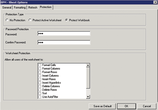 Now you can proceed with the final test to make sure no one can input actual data. Because the formatting is already in place (actuals are set to Lock Selected Cells), you just need to protect the workbook. Go to Tools > Options > Sheet Options. In the Protection tab select Protect Workbook and enter a password (Figure 48).