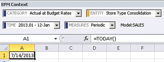 Step 5. Change the EPMOlapMember Function to Bring the Current Year, Month, and Category into the EPM Report