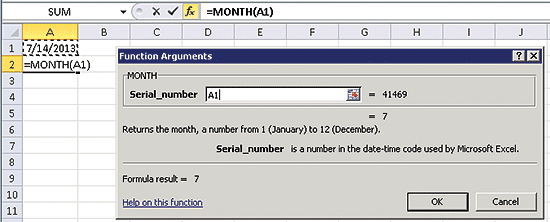 The second Excel function is used to return the current month. In this function, the MONTH function has been added, and its Serial_number property is set to read the current date in cell A1 (Figure 6).