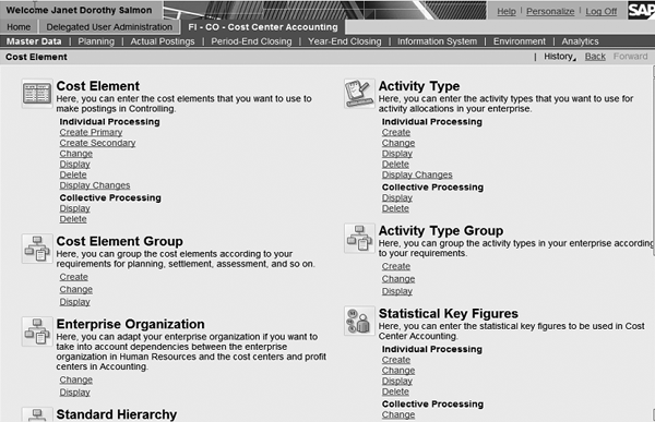 The sample role for CO-OM-CCA in Figure 1, comprises the worksets Master Data, Planning, Actual Postings, Period-End Closing, Year-End Closing, Information System, Environment, and Analytics. With the exception of Analytics, these worksets correspond to the menu folders in the SAP menu. The system generates a portal page that provides access to the assigned transactions. Clicking on each link on the page calls the appropriate transaction (e.g., KA01, create primary cost element) in a headerless portal window. All transactions behave exactly as before, so you do not need to retrain any of your users if they are already familiar with the existing transactions. The portal page simply reorganizes the users’ access to their work.