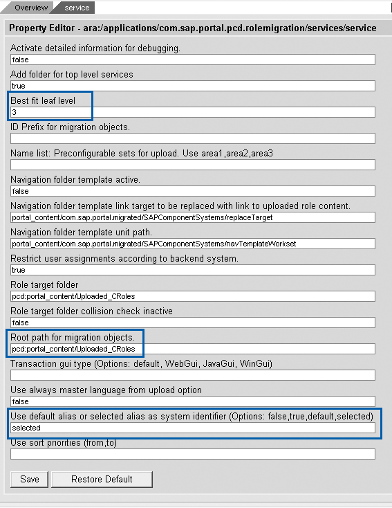 To view the relevant settings, follow menu path System Administration > Service Configuration > Role Migration > Services in the portal and set the following properties (Figure 4). Set the Best fit leaf level to 3. In Role target folder, enter the Portal Content Directory (PCD) menu path under which you can find the uploaded roles. In Root path for migration objects, enter the PCD menu path under which you can create the uploaded objects (e.g., iViews, pages, worksets). In Use default alias or selected alias as system identifier, enter selected as the default system alias that the system passes to the created iViews as a system property.