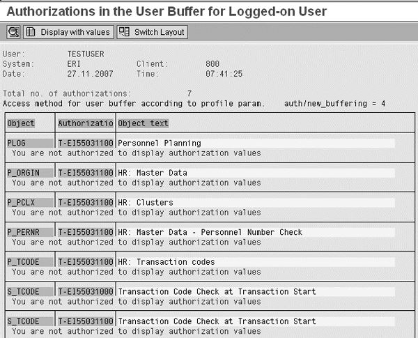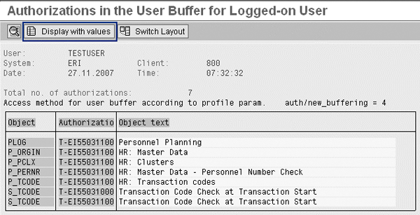 In the user buffer transaction SU56, TESTUSER can identify the authorization object and the relevant values assigned to the user or role. Click on the Display with values button to generate the detailed values of TESTUSER’s authorization object (Figure 4).