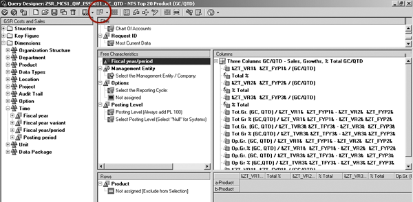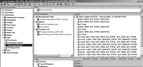 Step 4. Use the user exit product variable ZC_PRD28 in ZSR_MCS1_QW_ ESS0026_GC_QTD to derive the subtotals for the Top 20 and the remaining products (Figure 5). The query contains the same column structures as ZSR_MCS1_QW_ESS0011_GC_QTD. It uses another structure in the rows to show the subtotal of the top 20, the subtotal of the remaining products, and the grand total.