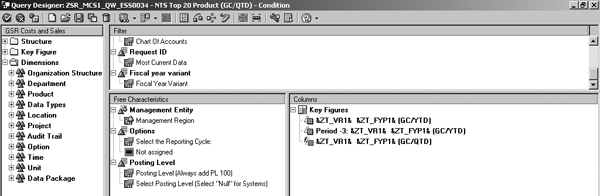 Step 1. Create a query with the condition that you show only top N products. In the screen shown in Figure 3, create query ZSR_MCS1_QW_ESS0034. This query is similar to ZSR_MCS1_QW_ESS0011_GC_QTD (the query from the previous section) and it uses the same Management Entity and Fiscal Period variables. You can follow the steps in the previous section to define the condition.