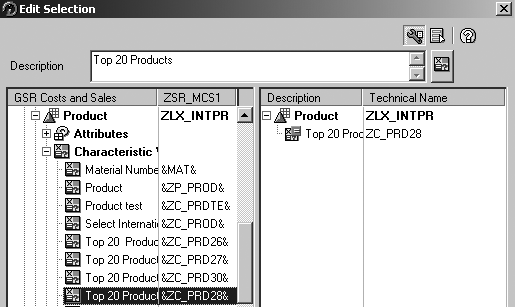 Select Top 20 Products under the row Structure. This brings up the screen shown in Figure 6. Then, drag Product from the left side to the right. Double-click on Product to specify the variable ZC_PRD28, which you use to restrict the Top 20 Products.