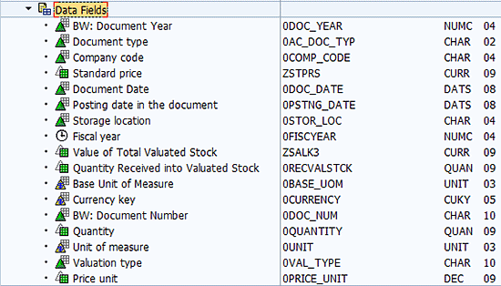 You now need to create a standard DSO under the Acquisition Layer InfoArea. The DSO contains all materials and movements. You also need to capture all records per material document, material, calendar month, plant, and debit/credit, so these InfoObjects are put under the Key fields section of the DSO (Figure 13). The rest of the fields you need are put under Data Fields section (Figure 14).