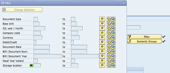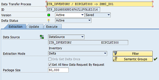 Now create a DTP with the semantic groups shown in Figure 45 and filter (Figure 46). You need to group all records into the same package by Material, Debit/credit indicator, Plant, and Calendar year/month.
