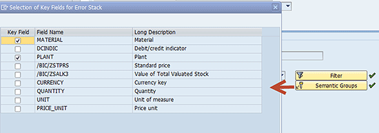 To get the correct summation of all key figures in the InfoCube, you need to group the same materials and plants in the same package. Click the Semantic Groups button, and then check off the fields for Material and Plant (Figure 32).