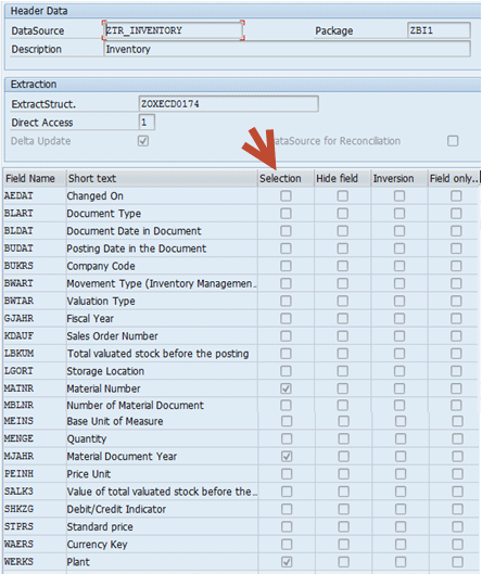 Click the save icon and then save the DataSource. In the subsequent Header Data screen, under the Selection column (Figure 8), check off the fields you want to use for filters in your InfoPackage. This is useful for testing purposes so that you don’t have to extract all materials movements for testing. Keep in mind that you do not need to use any filters in production when extracting data for live reporting.