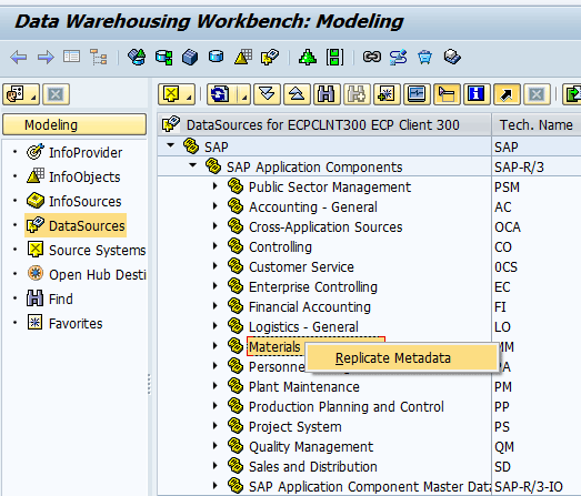 You saved the DataSource in SAP ECC in the MM component in the previous step, so in SAP NetWeaver BW, you replicate the MM component. Go to transaction RSA1 and click DataSources in the left panel. Find the MM component in the right panel, right-click it, and click Replicate Metadata (Figure 9).