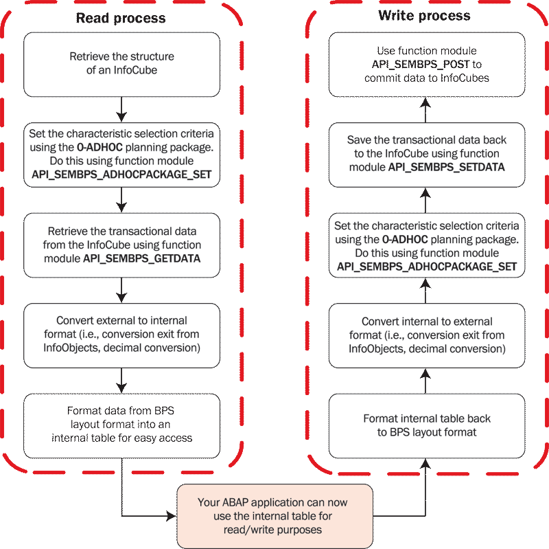 SAP provides function modules in a function group called UPC_API such as API_SEMBPS_GETDATA and API_SEMBPS_SETDATA to read and write to InfoCubes using Strategic Enterprise Management Business Planning and Simulation (SEM-BPS) customized definitions. BPS function modules require the technical IDs of the planning area, planning level, and planning package as import parameters to determine the specifications for processing. Data returned from API_SEMBPS_GETDATA includes a set of internal tables containing the layout information and transactional data.