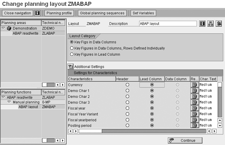 Choose the Key Figs in Data Columns button within the Layout Category area of the level (Figure 9). Under Additional Settings, set every characteristic as Lead Column. Click on the Continue button.