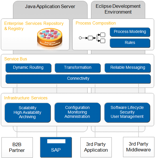 SAP NetWeaver Process Orchestration is a pure Java solution. It fits well with SAP’s strategy to move to a pure Java environment for SAP NetWeaver PI. SAP NetWeaver Process Orchestration is based on the JavaEE 5 application server as the runtime environment. The modeling and development tools are grouped together in SAP NetWeaver Developer Studio, which is founded on the Eclipse framework. Consequently, the functionality of the rich client Swing tools for SAP NetWeaver PI (namely Enterprise Services Builder and Integration Builder) were integrated into SAP NetWeaver Developer Studio by providing new Eclipse plug-ins. The Java application server as a common platform delivers the standard functionality summarized in the Infrastructure Services box of Figure 1.