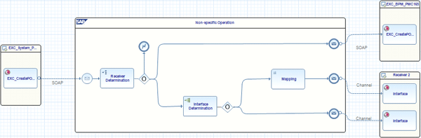 in their upper-left corners. Finally, you can recognize the adapter types (e.g., the SOAP adapter that sends the message) that are being used for connecting the respective systems. They are associated with the dashed arrows from the sender interface to the start event