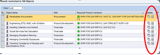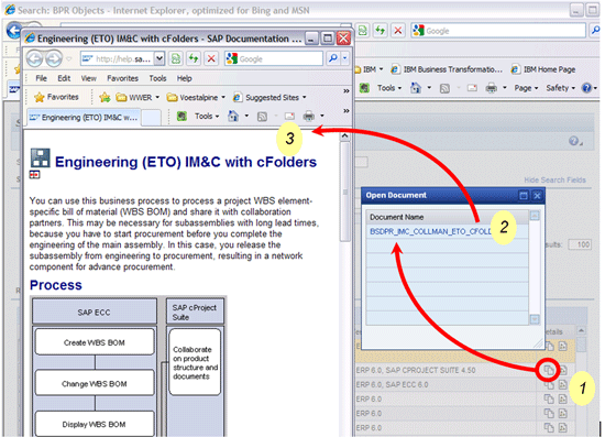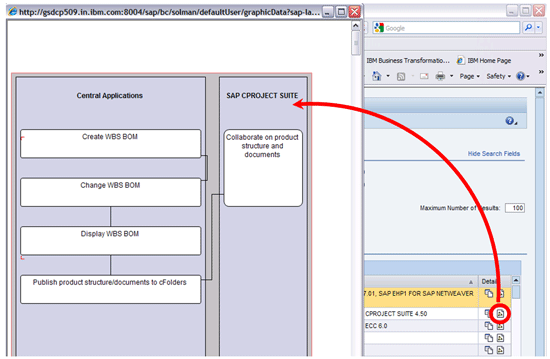 The Details column on the far right of the results view provides two icons: the show documents and show graphic icons. Clicking these displays the SAP Help information about the process (Figure 10). The show documents icon displays the SAP Help for the process (Figure 11). The show graphic icon displays the SAP Process Flow for the process (Figure 12).