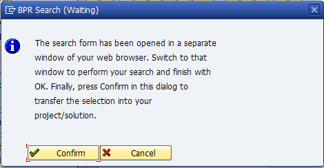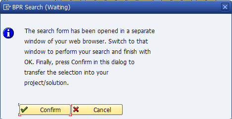 In SAP GUI, a pop-up box is displayed, indicating that the search is in another window and that you need to confirm your selections when you are ready to copy the content from the BPR to your project (Figure 4).